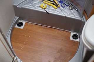 ( J'ai injecté également de la mousse sous la petite marche car cela permet de rigidifier le côté de cette marche.. L'injection se fera avec modération et surtout attendre que cela sèche au moins 24 h et ajuster au cutter le surplus de mousse. Avec le joint colle, j'ai utilisé le white-spirit pour lissage et nettoyage. )