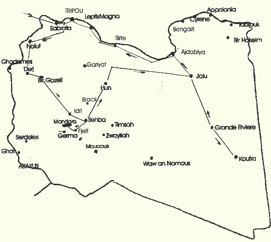 Tripoli ? C'est Tarabulus pour les arabisants , ville que l'on aborde avec une certaine inquiétude , mais grâce au périphérique , on passe sans encombre la capitale que dominent de nombreux ponts , sur lesquels trône l'effigie du président colonel Kadafi en pasteur , rassembleur de l'Afrique Maghrébine . Il porte beau et a fière allure .Il en faudrait peu pour qu'il soit tout à fait sympathique ...