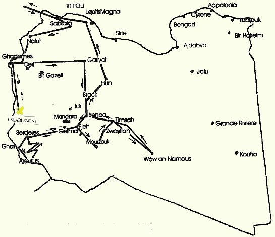 Au départ , nous manquons la piste pourtant indiquée sur le GPS et on se dirige plein ouest sur l'Algérie toute proche . La police frontalière nous remet sur le droit chemin . Et dès lors on se fiera aux points soigneusement inscrits sur le cahier et vers lesquels Magellan nous guide . Partis de Ghadamès on retrouvera le goudron seulement a Serdélès , c'est à dire dans 3 ou 4 jours ... au mieux ! Après avoir , sans doute , bien galèré .